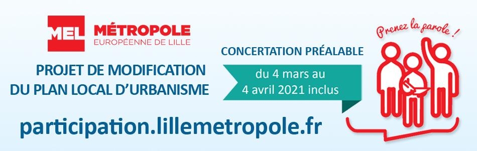 Le Président de la Métropole Européenne de Lille (MEL) porte à la connaissance du public qu’une concertation préalable est menée en vue de modifier le Plan Local d’Urbanisme sur son territoire en application de l’article L. 103-2 du Code de l’urbanisme.