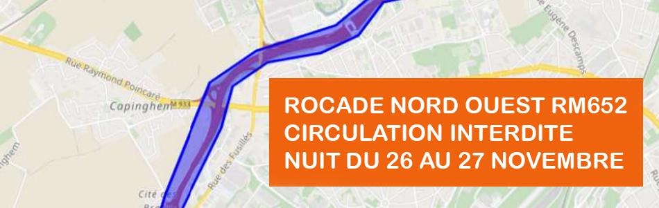 Au cours de la période comprise entre le 26/11/2021 et le 27/11/2021, la circulation des véhicules sera interdite de nuit de 23h00 à 08h00 sur la M652G entre les PR 2+000 et PR 2+870 dans le sens Wasquehal vers Englos, sur les communes de Lomme et de Capinghem.