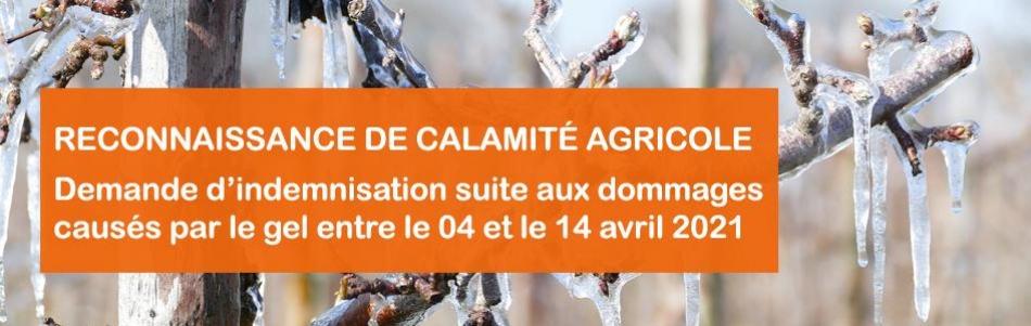 Suite aux dommages dus aux épisodes de gel survenus du 04 au 14 avril 2021 et sur avis favorable du comité national de gestion des risques en agriculture (CNGRA), le ministre chargé de l’agriculture reconnaît par arrêté en date du 15 octobre 2021, le caractère de calamité agricole pour :