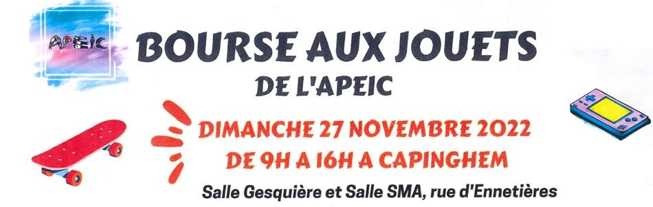 L’APEIC (Association des Parents d’Élèves Indépendante de Capinghem) organise une bourse aux jouets le dimanche 27 novembre, salles Robert Gesquière et Multi-Activités, de 09h à 16h (buvette et petite restauration sur place).