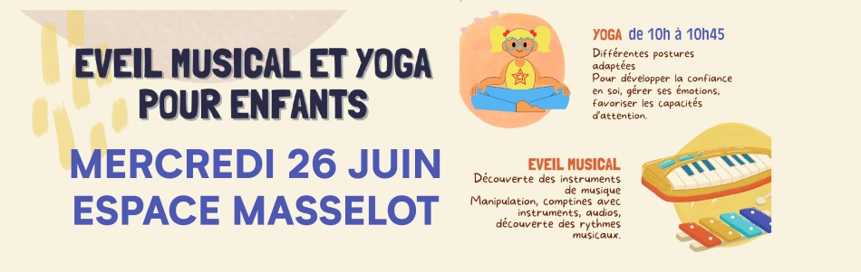 Marie-Charlotte, auxiliaire de puériculture, propose un atelier d'éveil musical et de yoga pour les enfants le mercredi 26 juin 2024 à l'Espace Masselot (yoga, de 10h à 10h45 et éveil musical de 11h à 11h45).