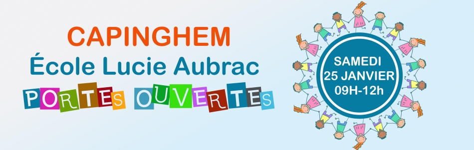 Les premières Journées Portes Ouvertes (JPO) du groupe scolaire Lucie Aubrac (école maternelle / élémentaire publique) se tiendront à Capinghem le samedi 25 janvier 2025, de 09h à 12h (2 bis rue d'Ennetières - 59160 CAPINGHEM).