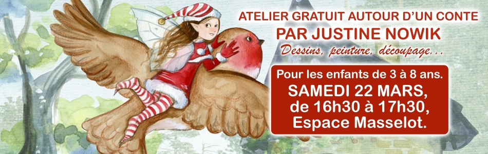 Justine NOWIK propose un atelier gratuit pour les enfants de 3 à 8 ans, le samedi 22 mars 2025, de 16h30 à 17h30, à l'Espace Masselot, 14 avenue Nelson Mandela - CAPINGHEM.