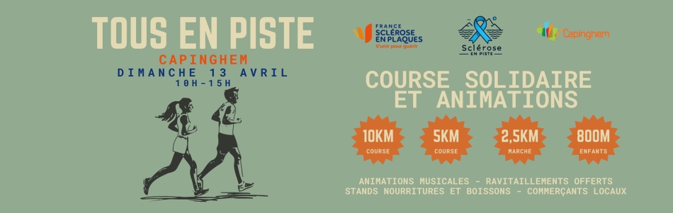 Rejoignez-nous pour une course caritative pleine d’énergie et de bonne humeur à Capinghem ! Toute l’équipe de Sclérose en Piste est impatiente de vous accueillir dans notre village chaleureux, où solidarité et convivialité seront au rendez-vous. Venez courir, marcher, ou simplement partager un bon moment avec nous – tout ça pour la bonne cause !