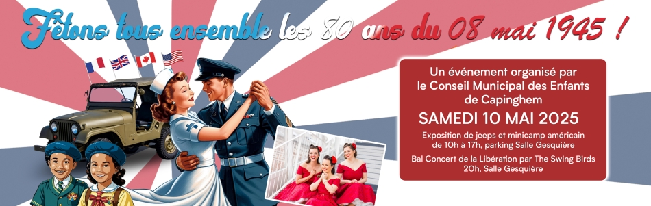 - 20h : Bal Concert de la Libération avec The Swing Birds, salle Gesquière (ouverture des portes à 19h30). Venez en costume des années 40 ! Buvette sur place assurée par l'Association Sportive de Capinghem. "Très inspirées par les Andrews Sisters, The Chordettes, Puppini Sisters et bien d'autres, les Swing Birds se spécialisent dans la technique de la close harmony, rendue célèbre dans les années 1940. A ce répertoire elles incluent également des musiques modernes populaires arrangées en version swing. Robes vintages, chorégraphies soignées, rythme jazz, harmonie... The Swing Birds pour le plus grand plaisir de vos yeux et de vos oreilles..."