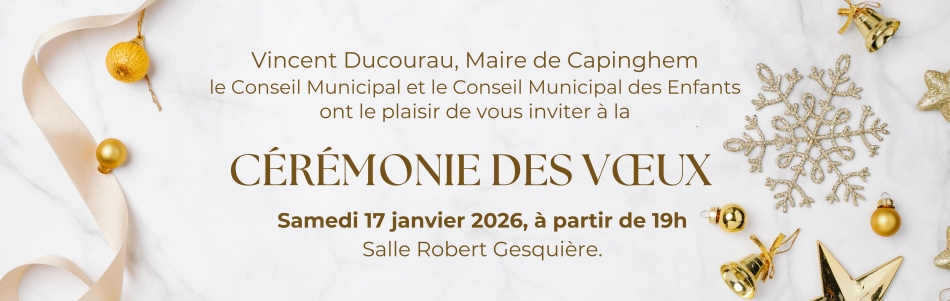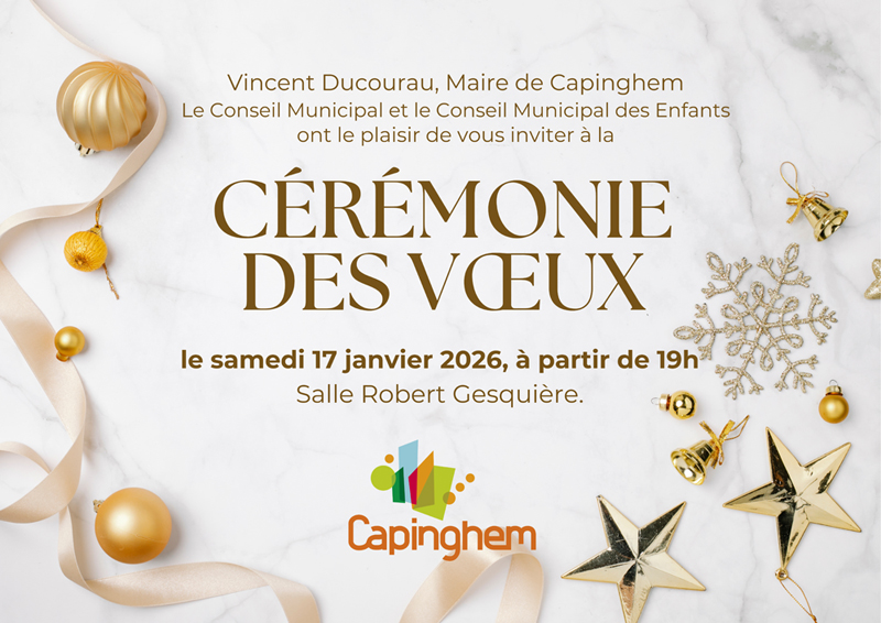 Vincent DUCOURAU, maire de Capinghem, le Conseil Municipal et le Conseil Municipal des Enfants, ont le plaisir de vous inviter à la cérémonie de présentation des voeux, le samedi 17 janvier 2026 à partir 19h, salle Robert GESQUIÈRE.