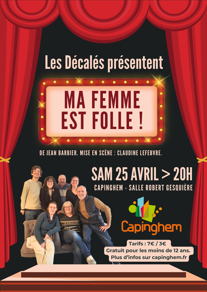 La troupe des Décalés vous propose une pièce de théâtre hilarante, Ma femme est folle (de Jean Barbier avec une mise en scène par Claudine Lefebvre) le samedi 25 avril 2026, 20h, Salle Robert Gesquière (ouverture des portes à 19h30).