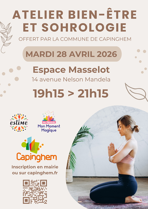 L’association Estime vous invite à participer à un atelier de deux heures offert par la commune, entièrement dédié au bien-être féminin, le mardi 28 avril 2026, de 19h15 à 21h15, à l'Espace Masselot (14 avenue Nelson Mandela, Capinghem).